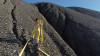 Wie ein Vermesser aus einer fremden Welt erobert der Protagonist die beeindruckende Realkulisse, eine Halde, die Produkt des menschlichen Eingreifens in die Natur ist. Das aktionistische Moment der Performance konzentriert sich auf das Besteigen des gigantischen grauen Kegels und den dynamischen Abstieg, bei dem das Entrollen des gelben Bandes symbolisch aufgeladen wird und zugleich grafisches Element ist. Das Erklimmen, Scheitern, Neubeginnen lassen eine sisyphosartige Handlung vermuten, sind aber Resultat des realen Vorgangs, der dem Zufall und der Spontanität unterworfen ist.